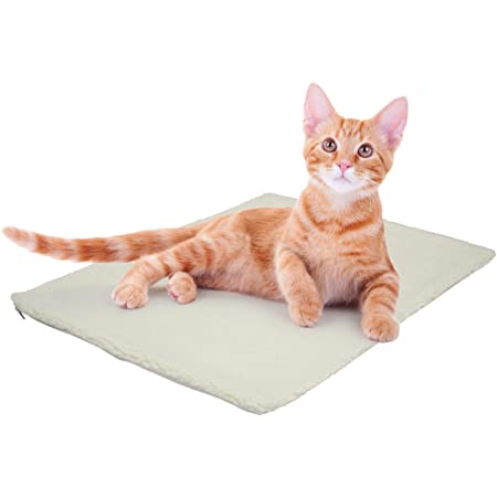 Pet pad with heat-reflecting core and lamb fleece style cover. Cover is removable and machine washable. Dimensions: 64x48cm.