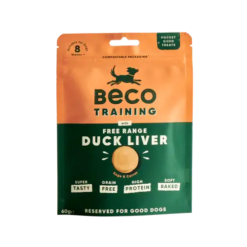 Small bites with a big flavour that dogs go wild for. These irresistible training treats help dogs master their skills through positive reinforcement. We only use free-range duck; free to roam, paddle in water and munch on juicy grubs. The sage and carrot in this recipe help maintain gut health. Pocket-sized and compostable packaging approved, ready to grab-and-go.