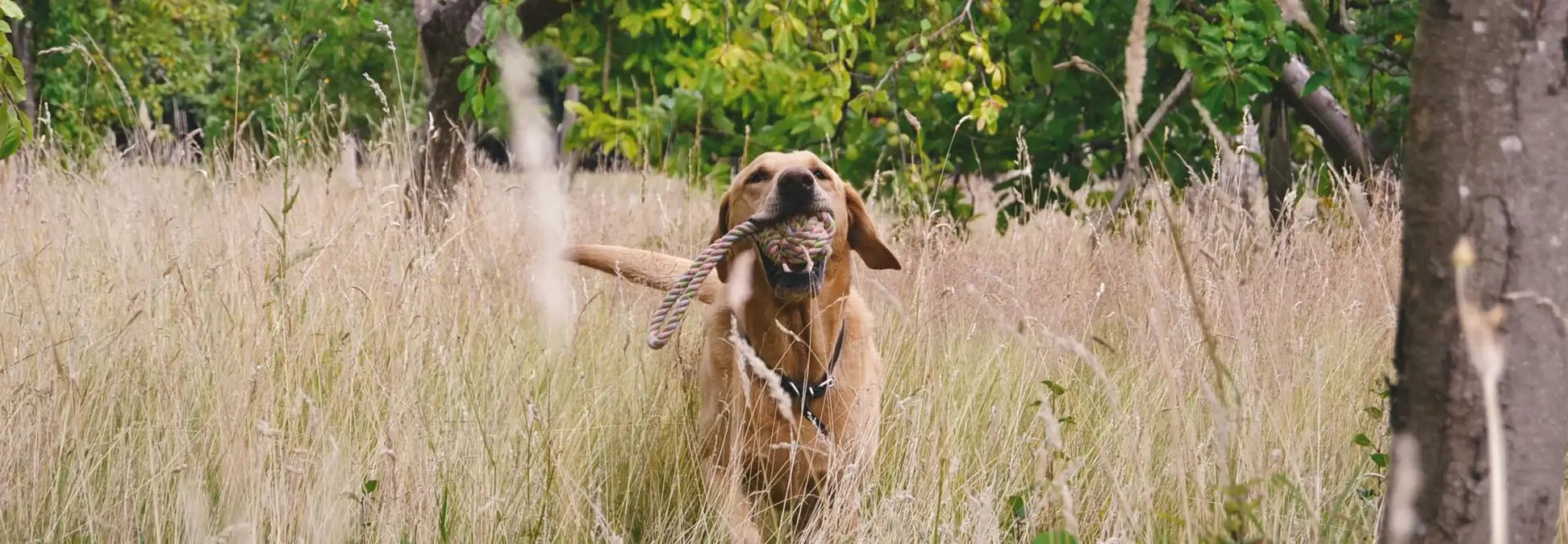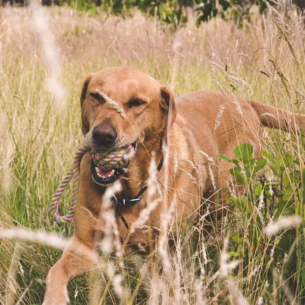 Made from hemp and recycled cotton this chunky interactive rope dog toy is strong and fun to play with. The handle means it’s great for a game of tug-o-war as well as giving humans extra throwing distance.