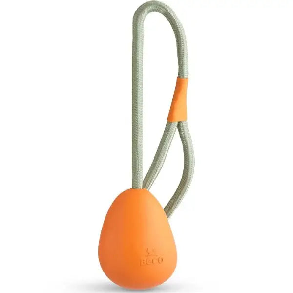 A natural rubber egg on a strong recycled rope. The springy natural rubber ball is easy for your dog to grip and the rope gives you extra throwing distance. Ideal for a game of fetch. The rubber has a gentle vanilla scent.