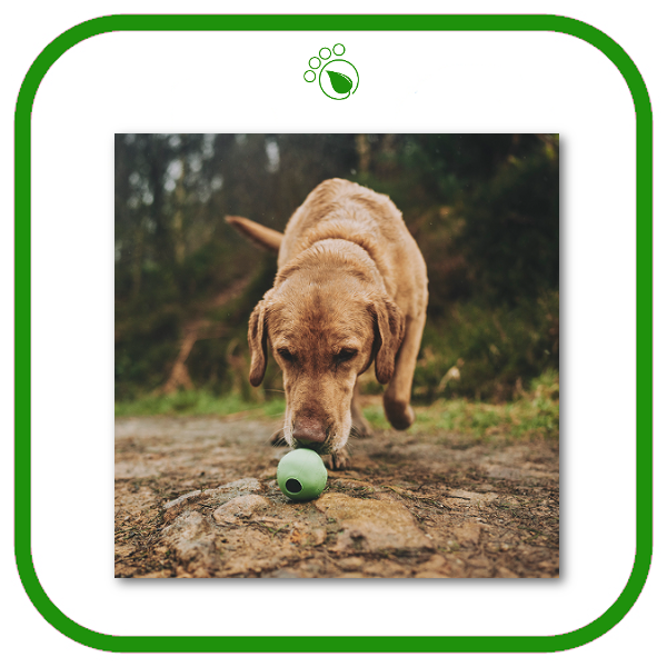 A natural rubber ball that bounces and wobbles and has a hole for hiding treats to keep your dog entertained.