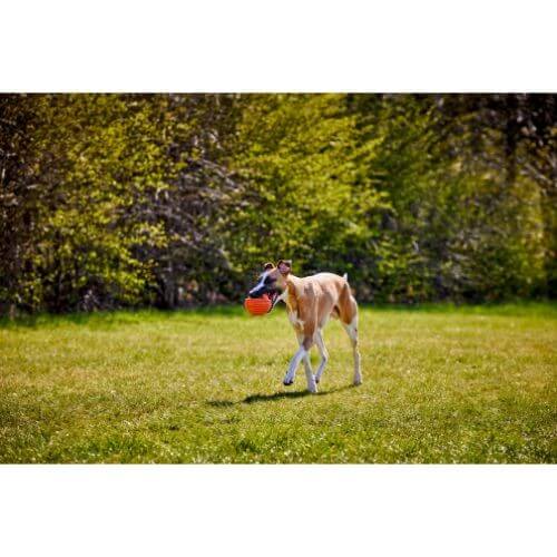 The medium DOGGI rugby ball is designed specifically for dogs who LOVE to chew, catch and carry. The rugby ball shaped tough dog toy can be carried either by the handle or, for larger dogs, much like a regular ball.