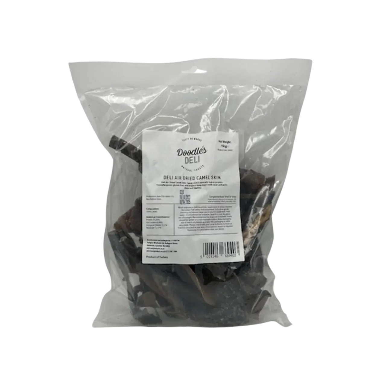 Deli Air Dried Camel Skin. Camel skin is a 100% natural high in protein chew for dogs. Hypoallergenic, gluten-free, and helps to keep dog’s teeth clean and gums clean and healthy.