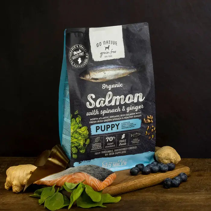 Go Native Puppy with Organic Salmon, Spinach & Ginger is perfect for your growing puppy, this Go Native Puppy Food is made with 70% delicious organic Irish salmon.
