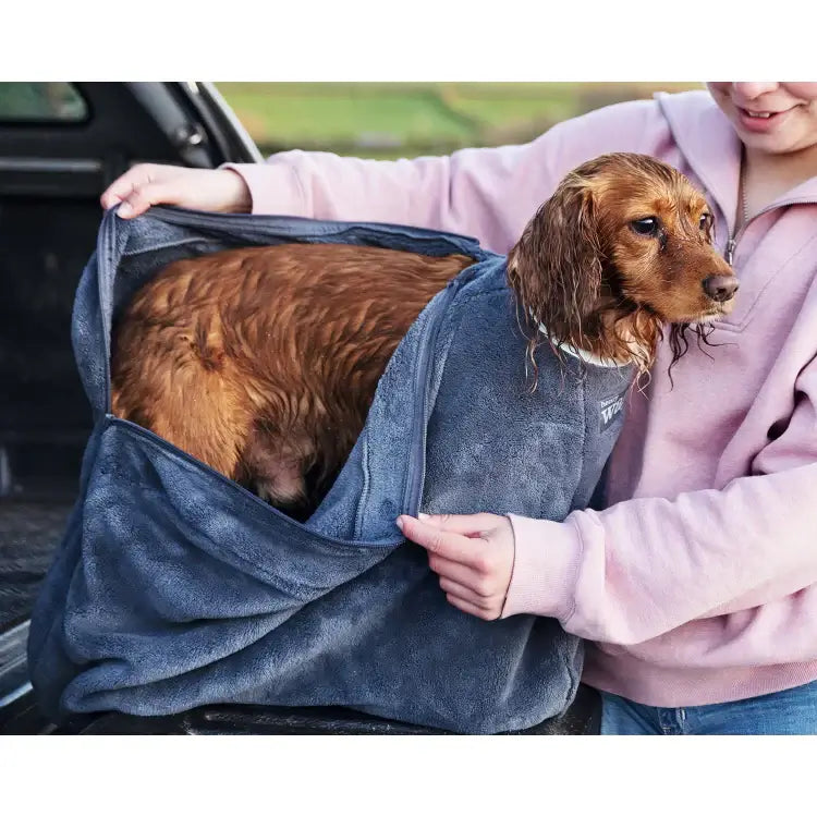 The microfibre Dog Drying bag from Henry Wag has been made using highly absorbent microfibre material which is effective at removing dirt and water from a dog’s coat. Use after wet walks to enclose your dog to wick away the water and dirt leaving your dog clean and dry. Ideal for use on soggy doggy’s after wet, muddy walks to protect car and home interiors.