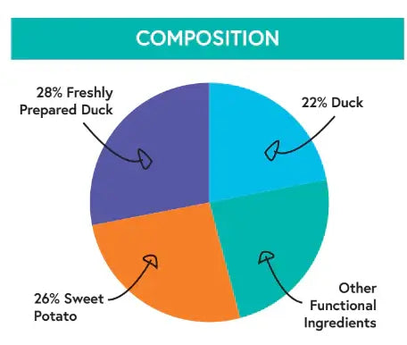 Composition. Duck 50% (including 28% Freshly prepared Duck, 20% dried Duck & 2% Duck stock), Sweet Potato, (26%) Peas (6%), Potato, Beet Pulp, Linseed, Omega 3 Supplement Vitamins & Minerals, Vegetable stock, Orange (0.3%), Cranberry, FOS (96mg/Kg), MOS 24mg/Kg).