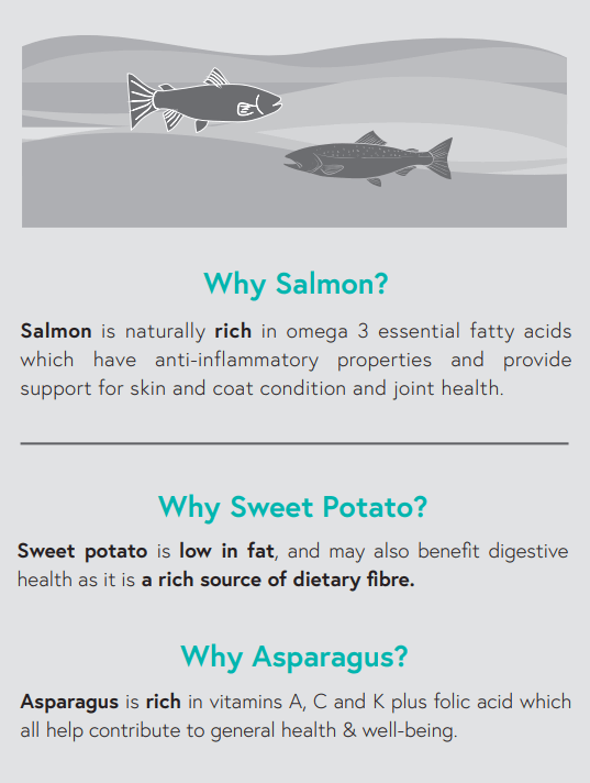 Composition: Salmon & Trout 53% (including Freshly Prepared Salmon & Trout 27%, Dried Salmon 20%, Salmon Oil 4% & Salmon Stock 2%), Sweet Potato (22%), Peas (9%), Potato, Beet Pulp, Linseed, Minerals, Omega 3 Supplement, Asparagus (0.3%), Fructooligosaccharides (FOS, 96 mg/kg), Mannanoligosaccharides (MOS, 24 mg/kg)