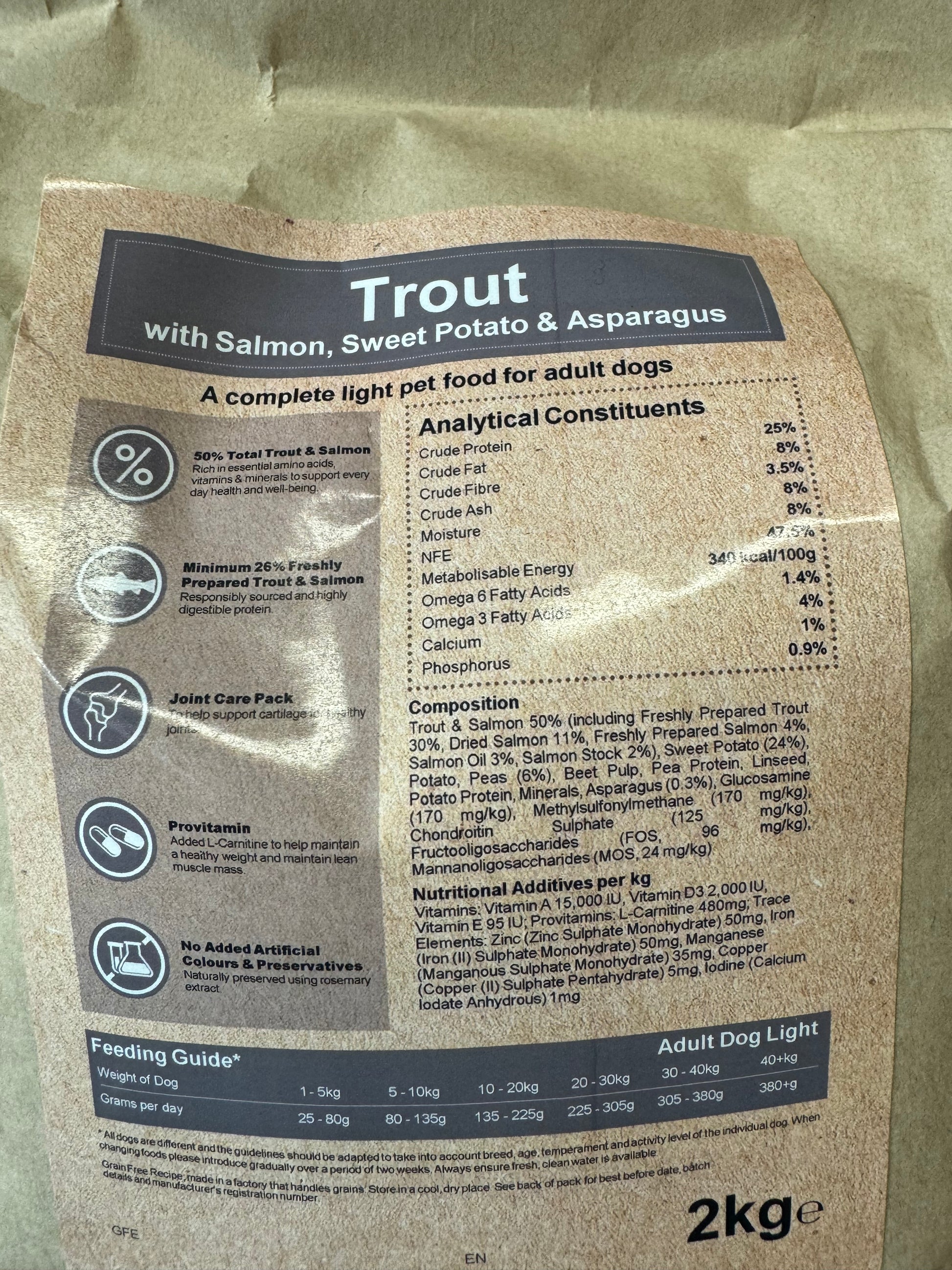 Grain Free Salmon with Trout, Sweet Potato & Asparagus Dry Senior/Light Dog Food is nutritionally balanced and packed with wholesome ingredients. Cooked to perfection from a recipe containing no wheat, beef, pork or dairy products.