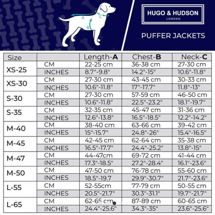 Hugo & Hudson dog puffer jackets come in 10 sizes and 10 colours with our signature navy which can be worn inside or out.