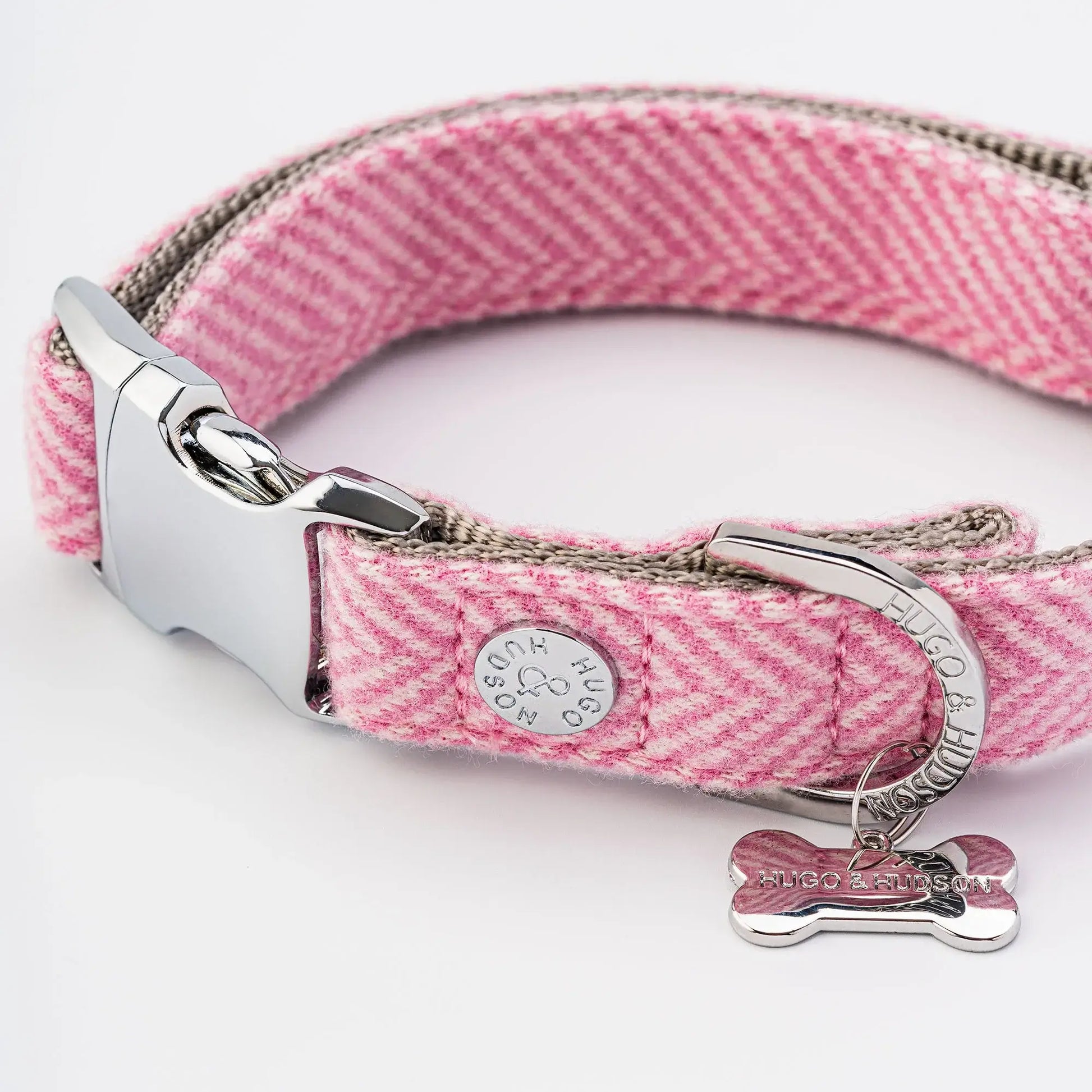 Treat your pup with the best of British style with our Pink Herringbone Tweed Metal Buckle Dog Collar. Crafted with luxury in mind, its quintessential herringbone tweed fabric is complemented by a strong metal buckle, ensuring a snug and secure fit. With 4 sizes to pick from, you’re sure to find the perfect fit for any breed or size! Matching dog lead and harness available.