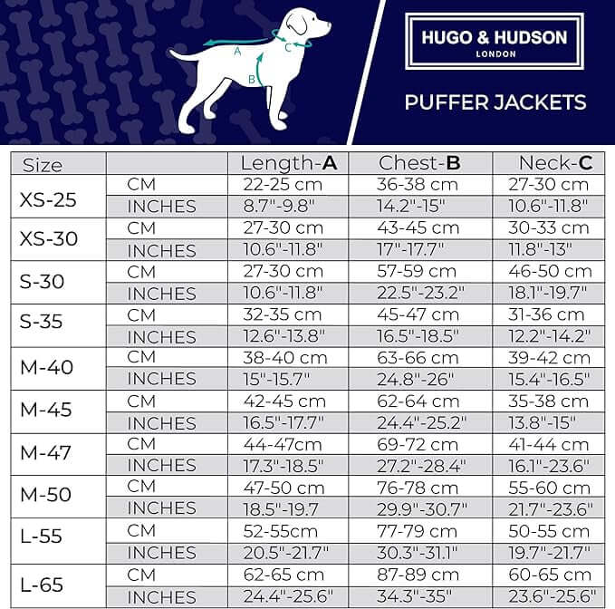 Hugo & Hudson dog puffer jackets come in 10 sizes and 10 colours with our signature navy which can be worn inside or out.