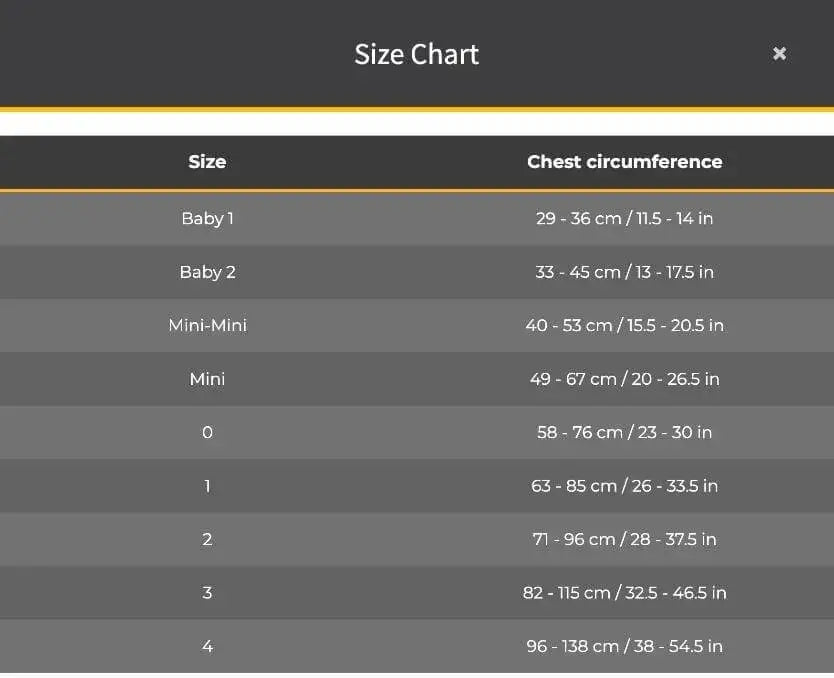 Choosing the correct size ensures maximum freedom of movement and protects the neck and shoulders. In order to select the correct size, it is essential to take accurate measurements. The girth of the dog should be measured behind the front legs, approximately four fingers away from them for sizes M/Size 0, L/Size 1, XL/Size 2, 2XL/Size 3 and 3XL/Size 4, and two fingers away from them for sizes 3XS/Baby1, 2XS/Baby2, XS/ Mini-Mini, and S/Mini. If any measurement fits the next size, choose the bigger one. Always measure your dog’s weight too and take it into account when choosing the size.