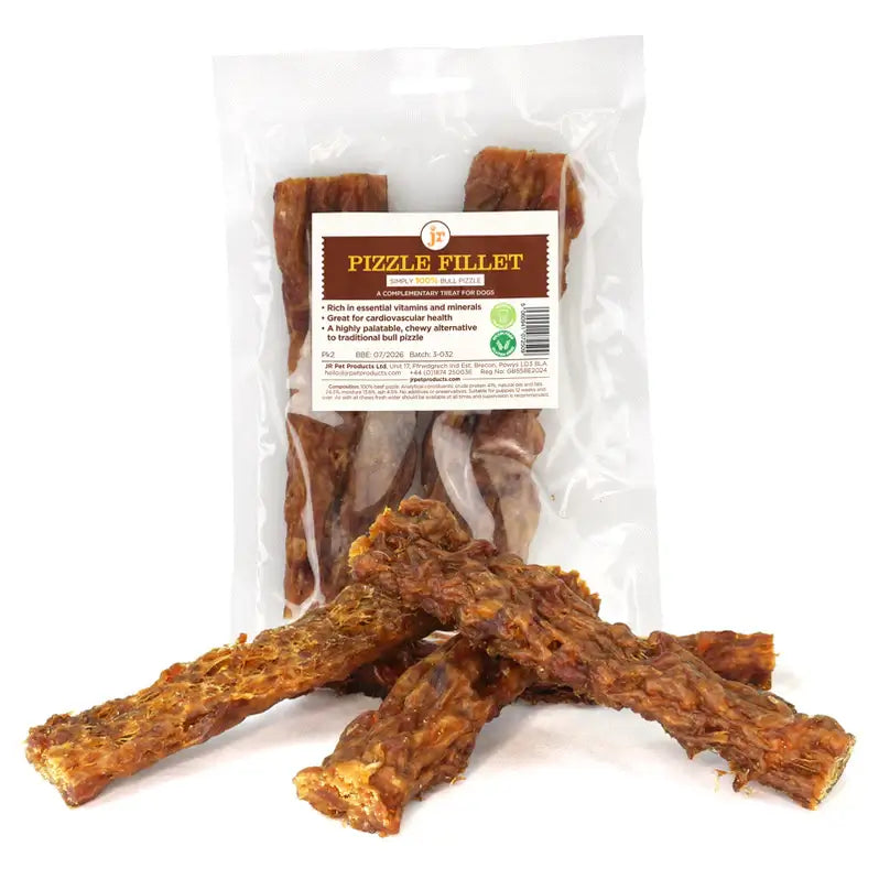 Our NEW Pizzle fillets by JR are one of a kind! They are made from 100% Natural Beef Pizzle. Simply air-dried with No additives, No Preservatives, Nothing! These fillets have a chewy and fibrous texture for a medium lasting satisfying chew. They provide a complete source of Amino Acids which supports muscle, brain, skin & coat and a natural source of Taurine which benefits cardiovascular health. A highly palatable chewy alternative to traditional bull pizzle!
