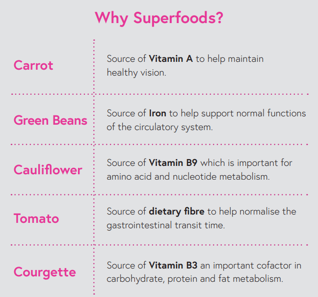 - Superfood blend: a blend of 5 carefully selected superfoods each with their own unique benefits.