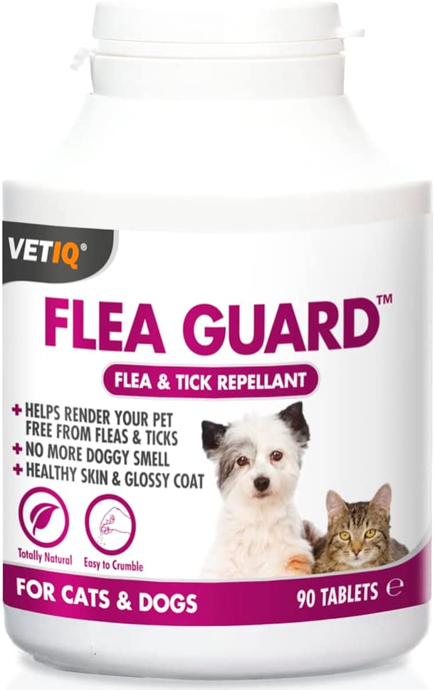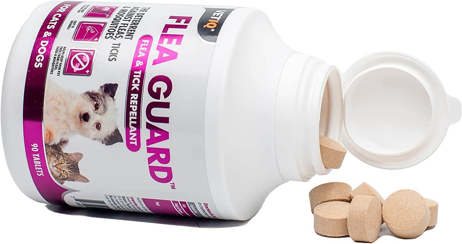 - Flea Treatment For Dogs & Cats: VetIQ Flea Guard tablets contain a totally natural unique blend of ingredients that helps to repel fleas, ticks & mosquitoes. No drops to put on the back of the neck; no lasting chemicals in your pet’s skin or bloodstream