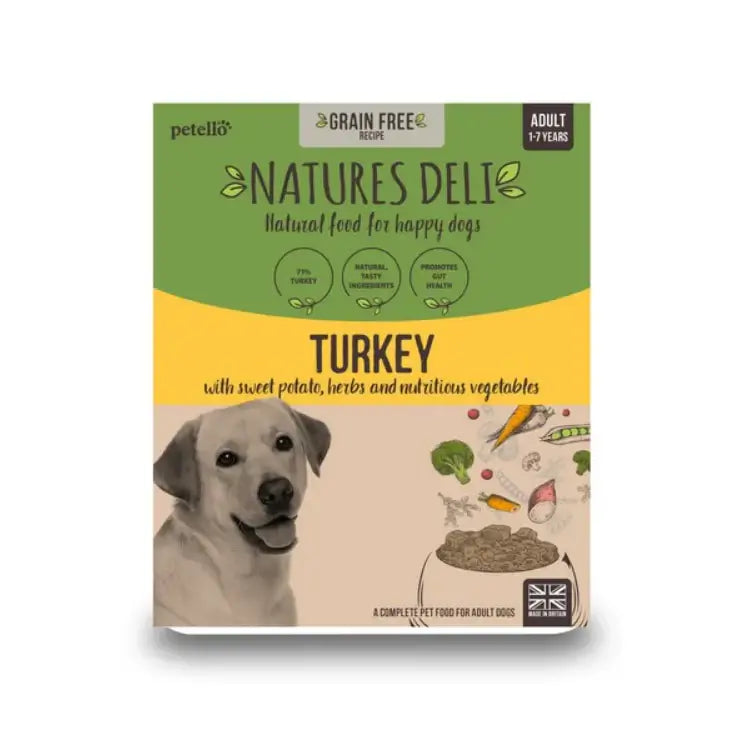 A natural dog food that promotes healthy digestion, our perfectly balanced nutritious recipes are created using only high-quality ingredients. Natures Deli Grain Free Wet Food is available in a range of flavours and varieties that we know dogs will love at any stage of their life. Made in Britain, using only the highest quality ingredients. 71% Turkey.