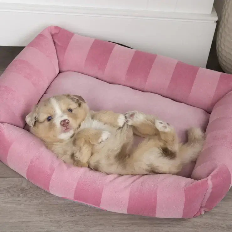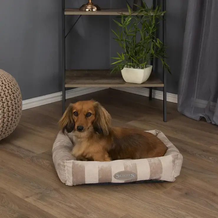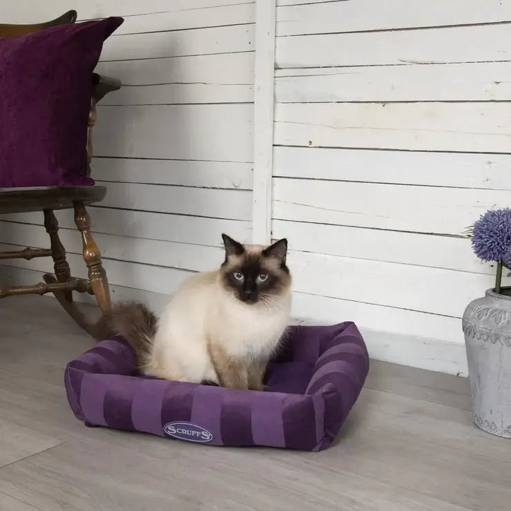 This tan coloured Scruffs® AristoCat Cat Bed is a rectangular shape with a wide pinstripe pattern on the sides of the lounder. It has a soft and luxurious lining for maximum comfort for your cat or small dog. Whether your cat likes to lounge, snuggle or curl-up; the AristoCat collection is just purr-fect! Machine washable.