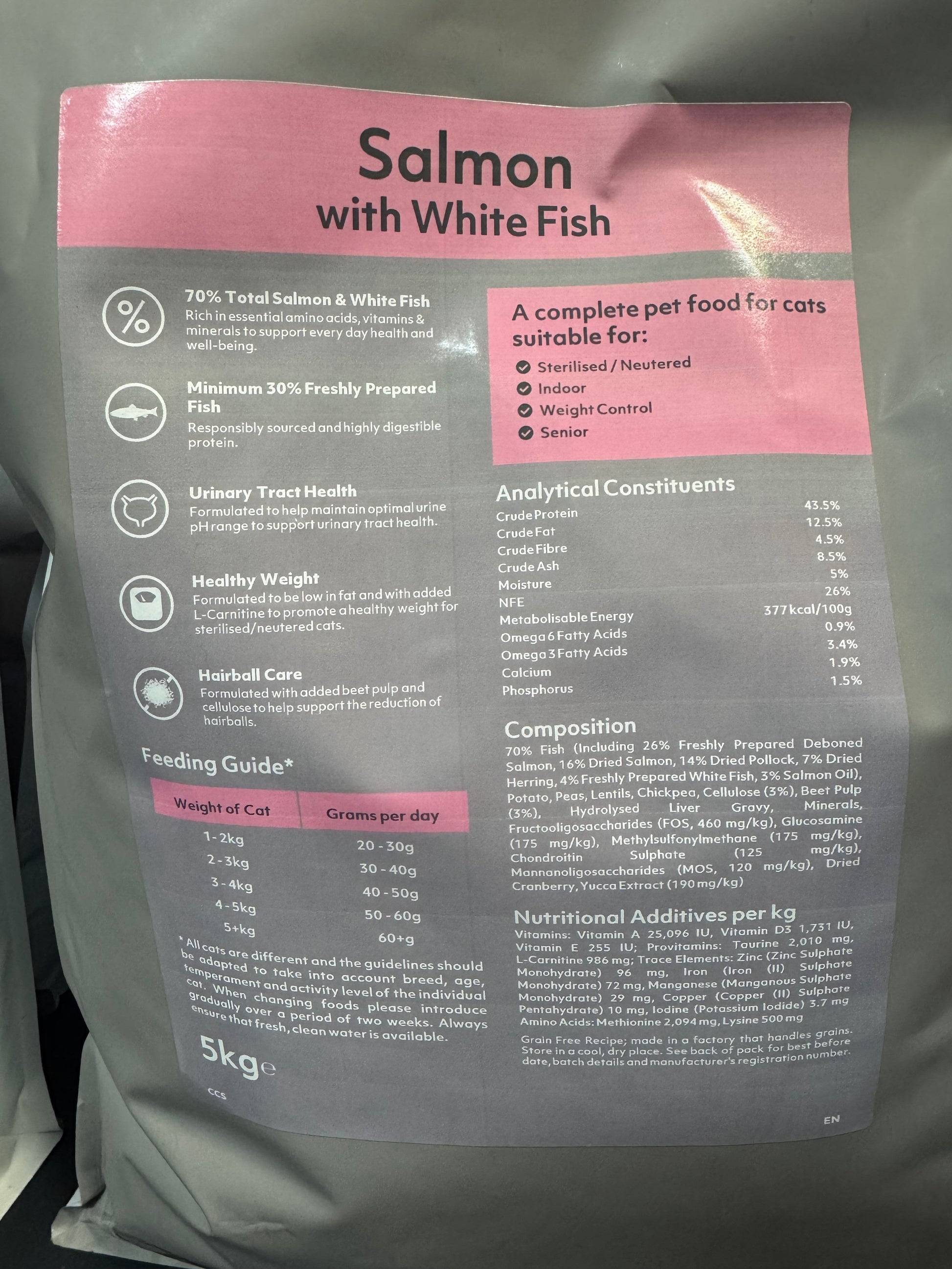 Composition: 70% Fish (Including 26% Freshly Prepared Deboned Salmon, 16% Dried Salmon, 14% Dried Pollock, 7% Dried Herring, 4% Freshly Prepared White Fish, 3% Salmon Oil), Potato, Peas, Lentils, Chickpea, Cellulose (3%), Beet Pulp (3%), Hydrolysed Liver Gravy, Minerals, Fructooligosaccharides (FOS, 480 mg/kg), Glucosamine (180 mg/kg), Methylsulfonylmethane (180 mg/kg), Chondroitin Sulphate (125 mg/kg), Mannanoligosaccharides (MOS, 120 mg/kg), Dried Cranberry, Yucca Extract (180 mg/kg)