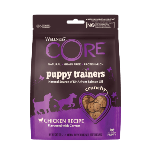 Our Wellness CORE Puppy Trainers Chicken Flavoured with Carrots are the best complement to our CORE dry and wet nutrition. It is a natural crunchy treat, crafted with a tasty protein, healthy antioxidants and linseed to support your puppy's well-being. They also suppot Brain & Eye Development thanks to the guaranteed levels of DHA from Salmon Oil. With an ideal size and fun shapes, our Puppy Trainers are perfect for training or just as a healthy guilt-free snack.