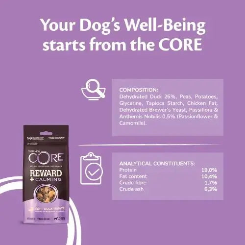 Wellness CORE Reward+ Treats are a tasty, delicious, healthy range of dog treats with additional health benefits. The calming recipe is specifically formulated to support your dog when they need to relax or stay calm, the duck recipe also includes passionflower and chamomile to help calm your dog.