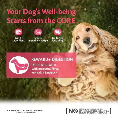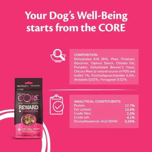 Wellness CORE Reward+ Treats are a tasty, delicious, healthy range of dog treats with additional health benefits. The krill treat recipe is specifically crafted to help promote healthy digestion in your dog. Each treat is packed with prebiotics, fibres, aniseeds & fenugreek to help your dog with their digestive health.