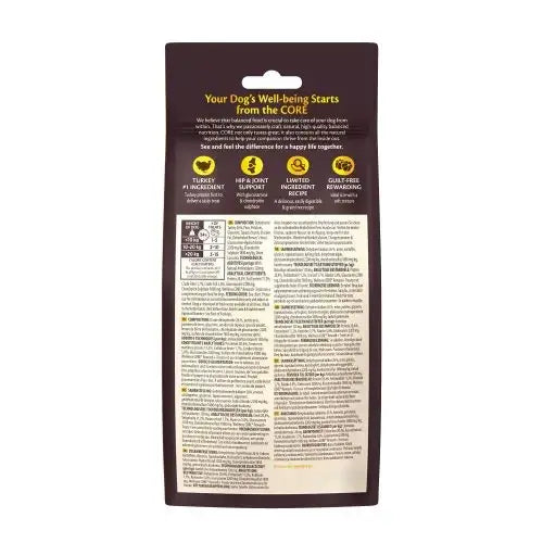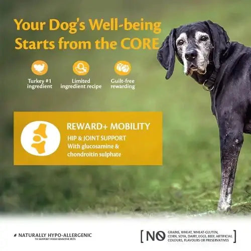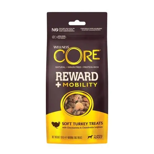 Wellness CORE Reward+ Treats are a tasty, delicious, healthy range of dog treats with additional health benefits. The Turkey Mobility recipe not only offers a delicious reward for your dog, but the recipe includes glucosamine & chondroitin sulphate to support your dog’s joints.