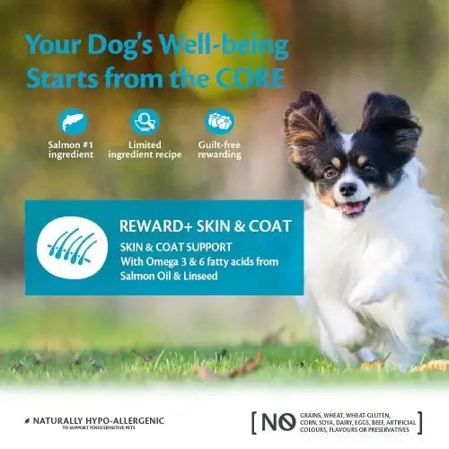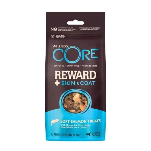 Wellness CORE Reward+ Treats are a tasty, delicious, healthy range of dog treats with additional health benefits. The salmon skin & coat recipe is made from salmon oil and linseed oil- giving your dog those essential omega fatty acids to help keep their coat and skin shiny and healthy.