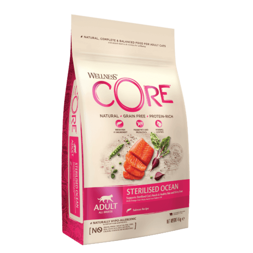 Wellness CORE Sterilised Ocean is designed to support Sterilised cats' needs & support a Healthy Skin & Shiny Coat thanks to a guaranteed level of Omega 3 & 6 Fatty Acids from Salmon oil.