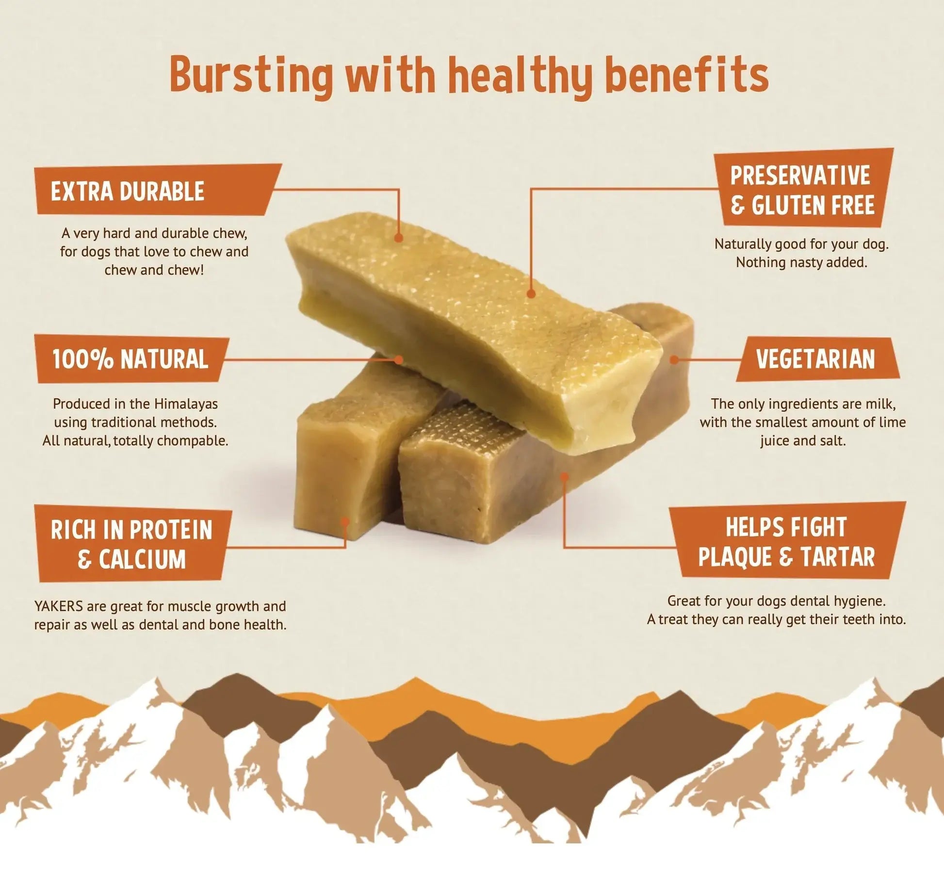 YAKERS find their origin in the hills of the Himalayas. Originally made for human consumption, they are still widely eaten by the Himalayan people and their dogs. They are made from a mix of skimmed Yak and Cow milk. A very small amount of lime juice and salt is added to coagulate (harden) the milk, which is then compressed into blocks and smoke dried for 28 days to give the chews their unique flavour.